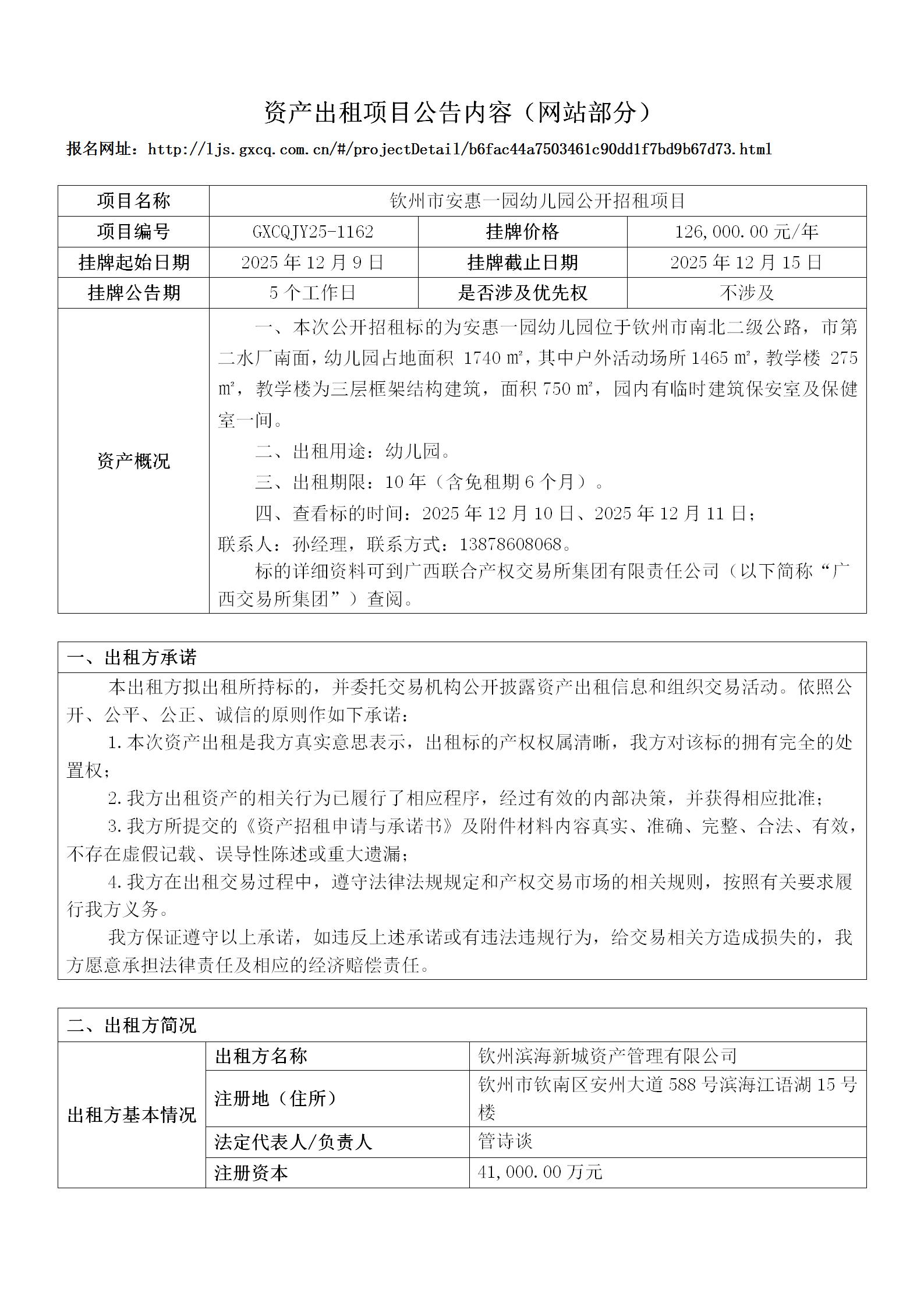 欽州市安惠一園幼兒園資產(chǎn)出租項(xiàng)目公告內(nèi)容(公共資源)