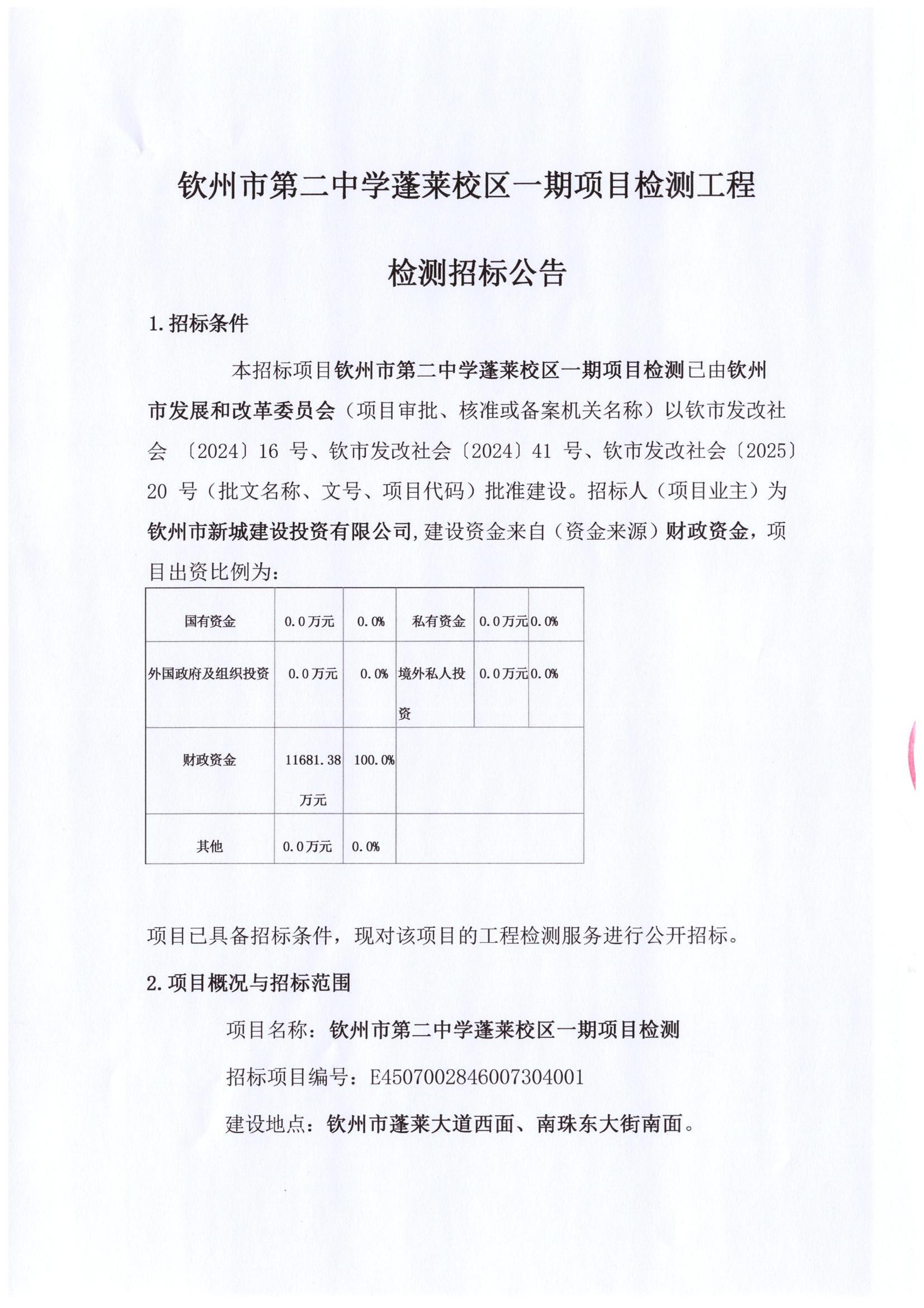 欽州市第二中學(xué)蓬萊校區(qū)一期項(xiàng)目檢測(cè)工程檢測(cè)招標(biāo)公告