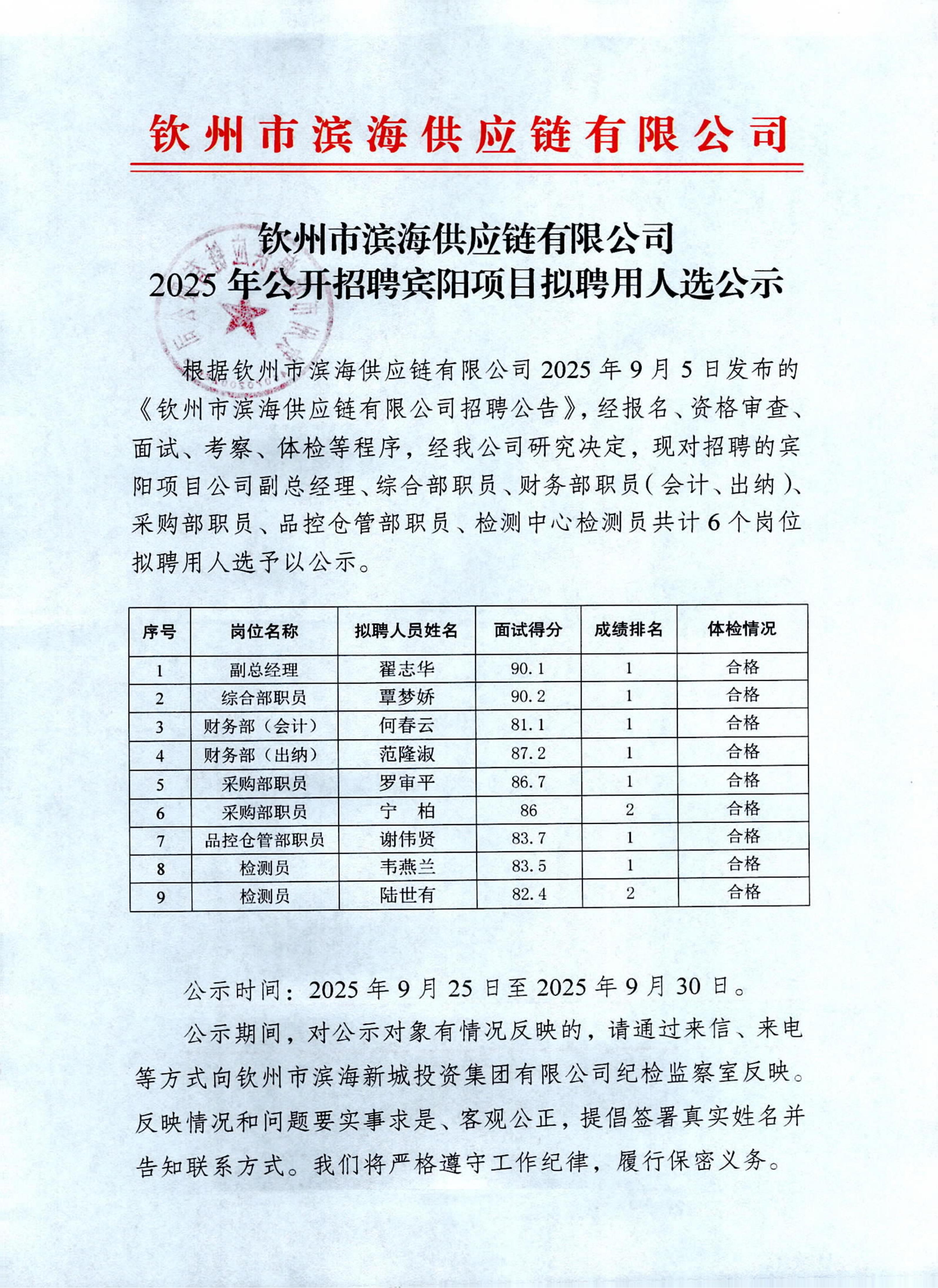欽州市濱海供應鏈有限公司2025年公開招聘賓陽項目擬聘用人選公示