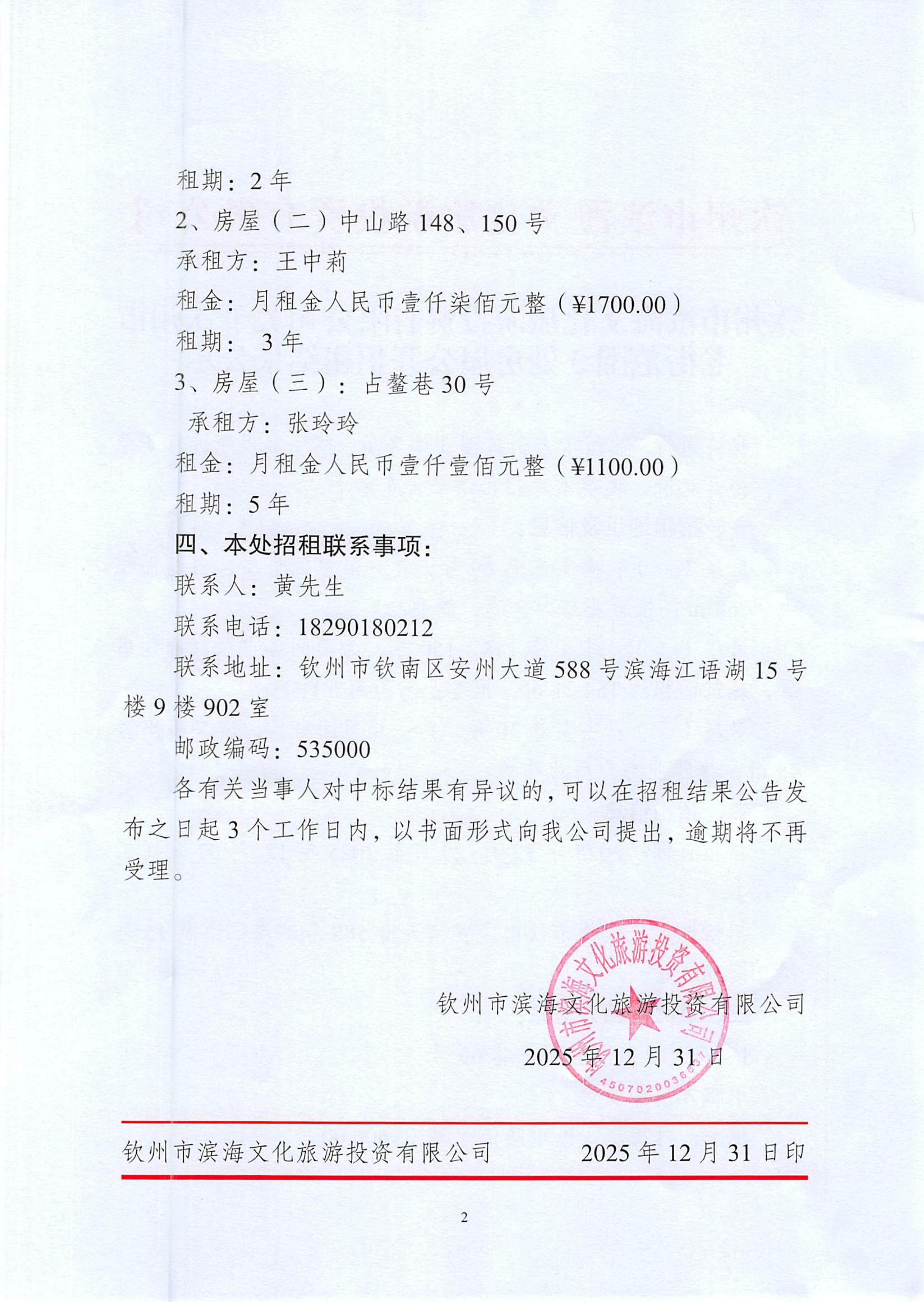 欽州市濱海文化旅游投資有限公司關于欽州市老街范圍3處房屋公開招租結果公示